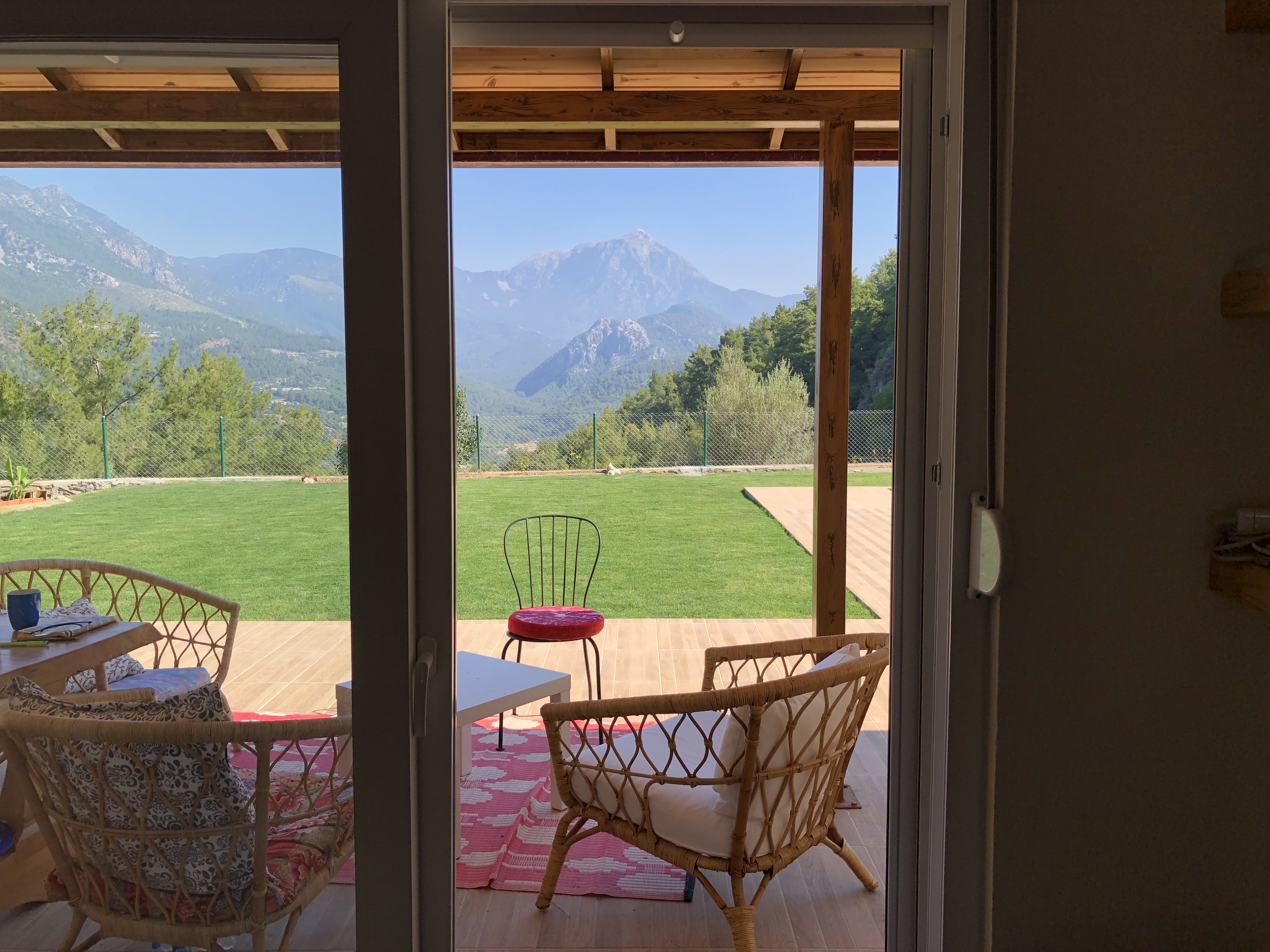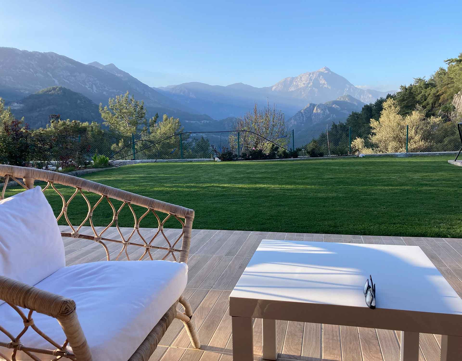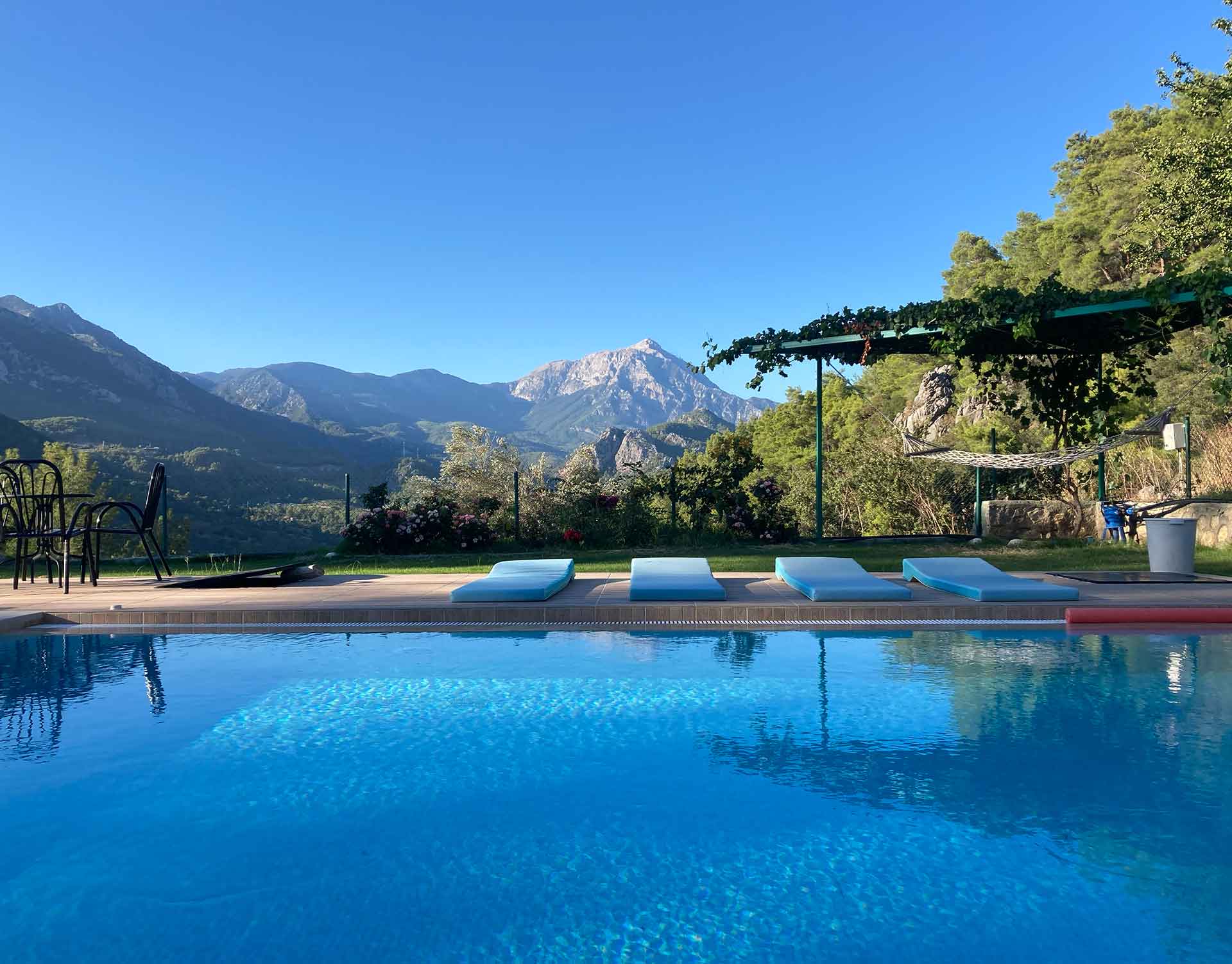 Der faszinierende Terrassen-Blick mit Bergpanorama auf den (oft von November bis Juni) schneebedeckten 2365 m hohen Tahtali krönt diese Oase der Ruhe. Der Berg galt als kleinasiatischer Olymp den antiken Griechen zurecht als „Wohnsitz der Götter.“
