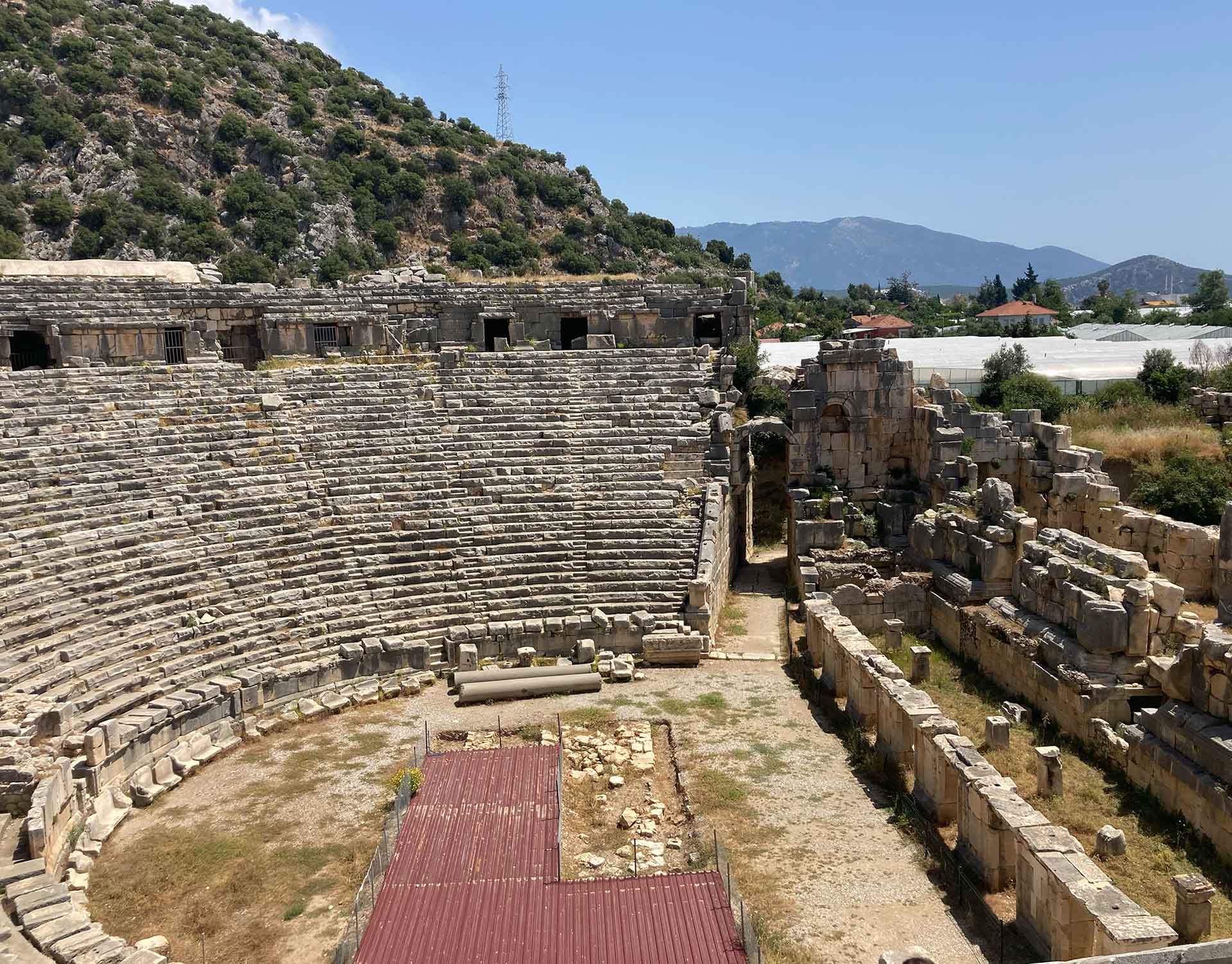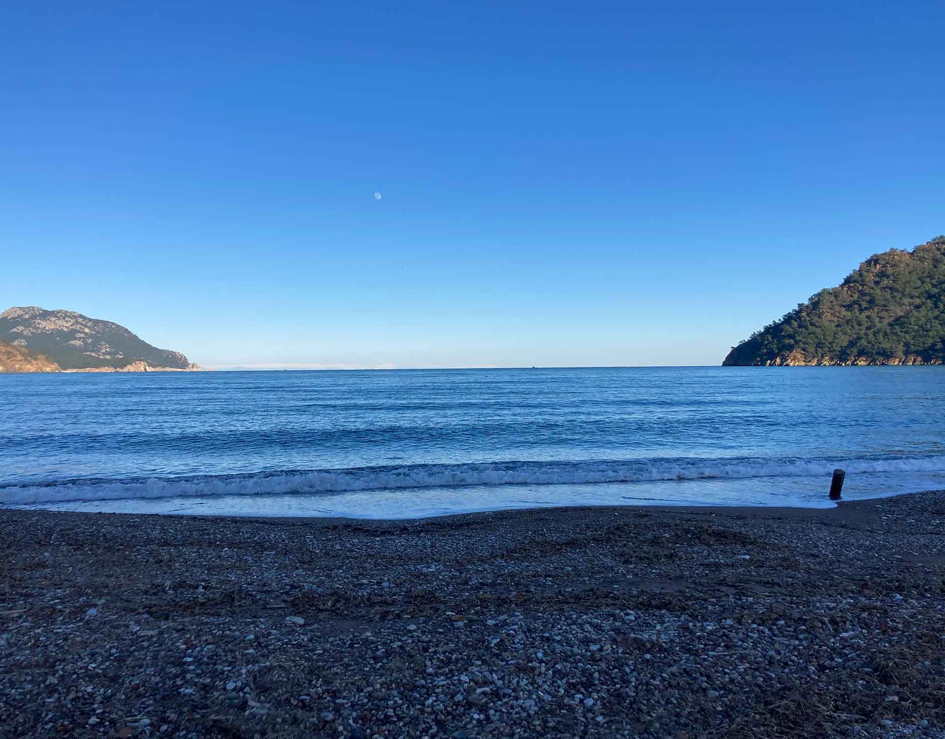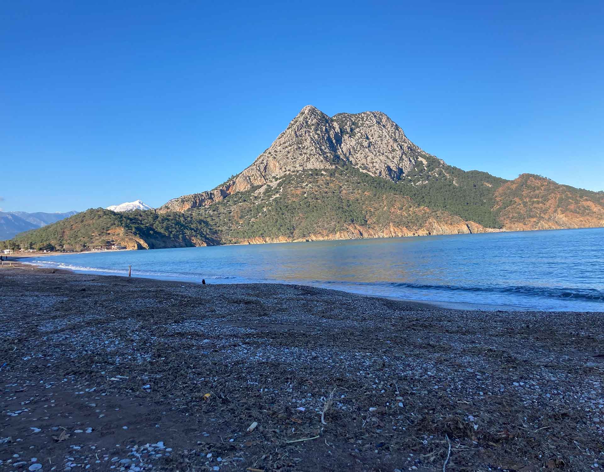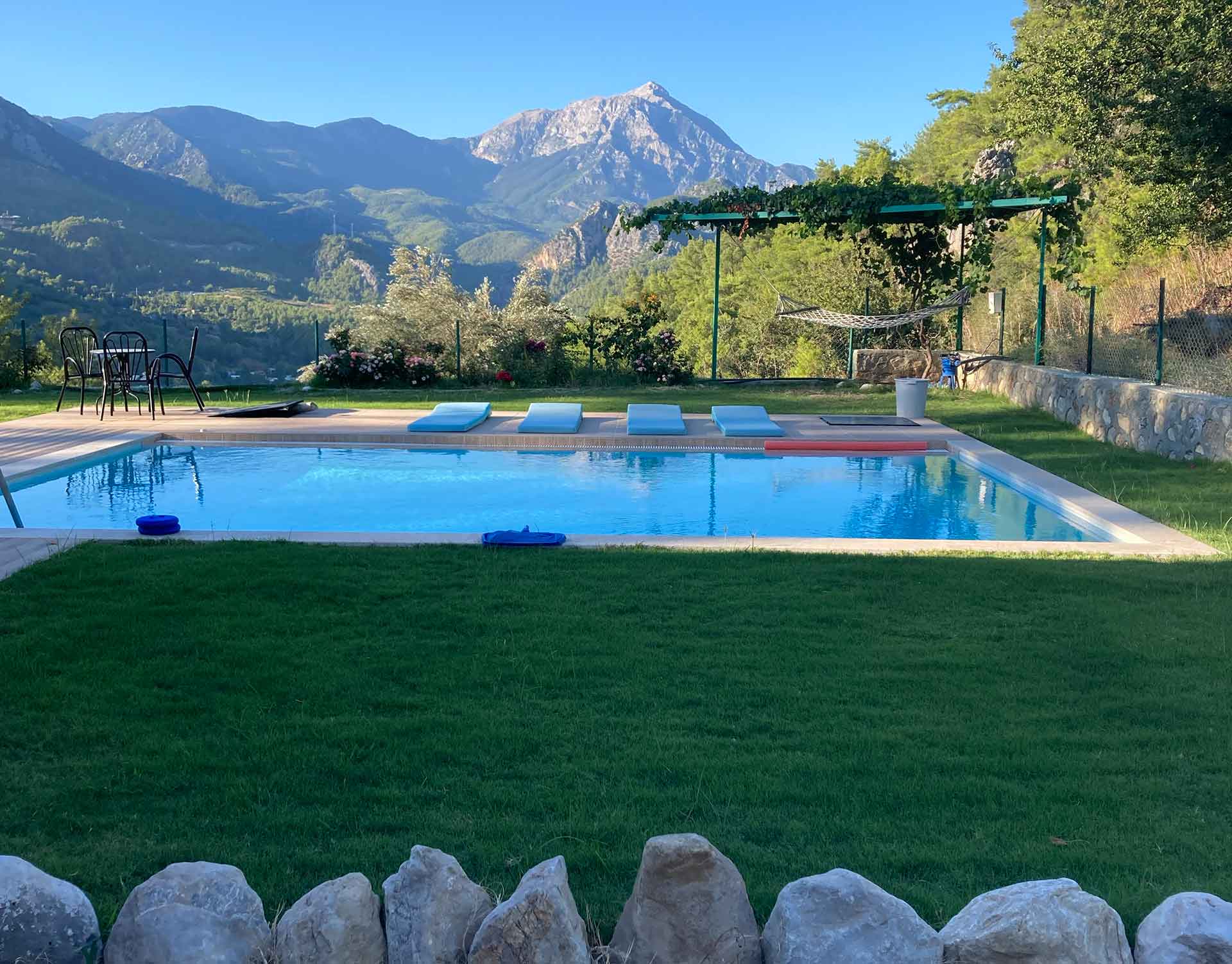 Der faszinierende Terrassen-Blick mit Bergpanorama auf den (oft von November bis Juni) schneebedeckten 2365 m hohen Tahtali krönt diese Oase der Ruhe. Der Berg galt als kleinasiatischer Olymp den antiken Griechen zurecht als „Wohnsitz der Götter.“