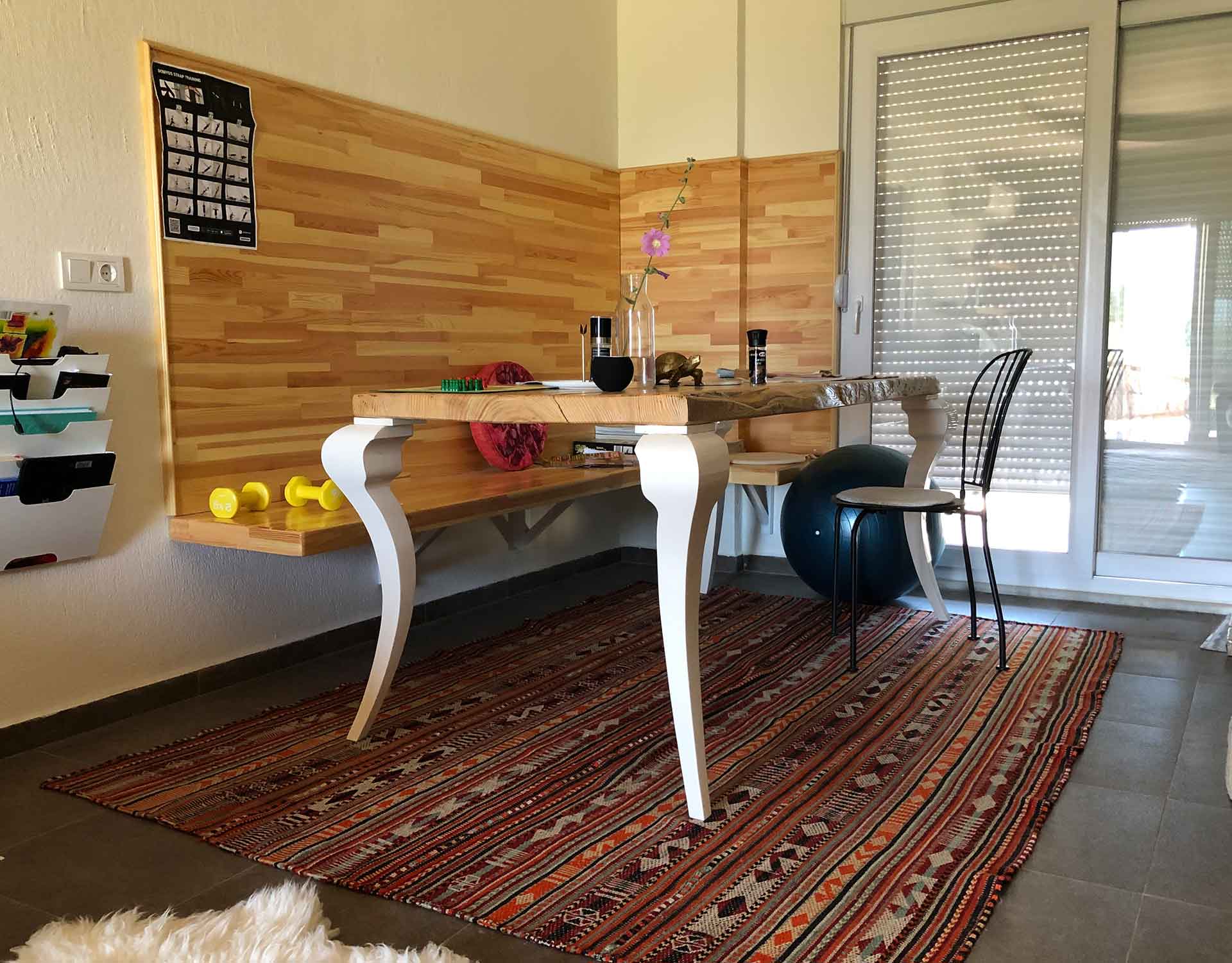 Großzügiger Eß-/Wohnraum mit gemütlicher Eckbank und italienischem Designer-Tisch mit naturbelassener Tischplatte aus ukrainischem Walnußbaum-Holz und edler Leder-Coach / Sesselkombination mit echten Schaffellen und einem geschlossenen Kaminofen für die kältere Jahreszeit.